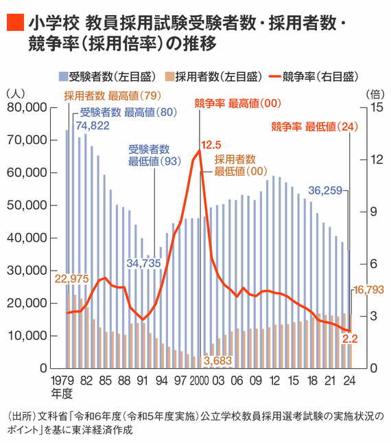 2023年度に実施された教員採用試験の倍率が過去最低を更新したことが、文科省調査でわかった。小学校は2.2倍、中学校は4.0倍、高校は4.3倍(いずれも全国合計値)で各校種とも過去最低、中でも小学校が低い。