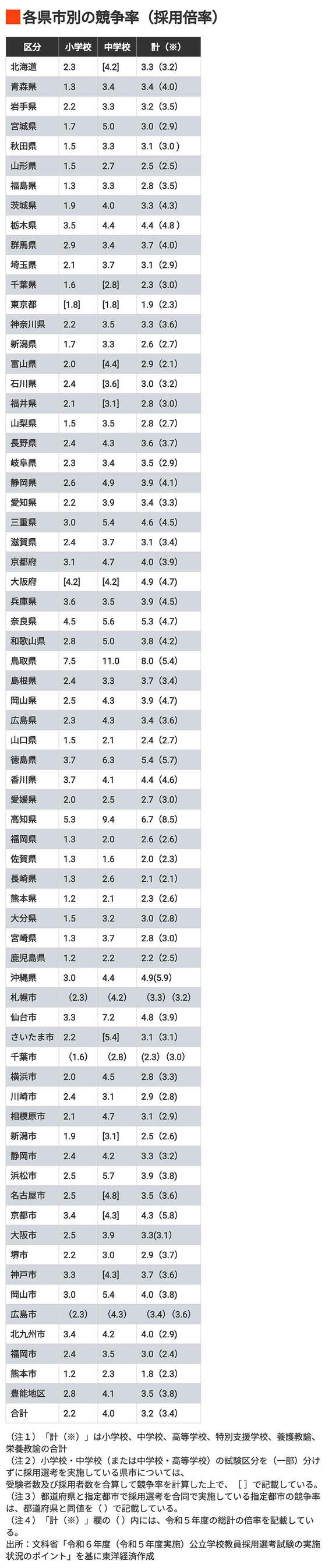 多くの報道が、文科省「令和6年度(令和5年度実施)公立学校教員採用選考試験の実施状況について」でまとめられているとおり、全国合計値での倍率が過去最低うんぬんと報じているが、注意が必要だ。ここでは3点指摘する。
