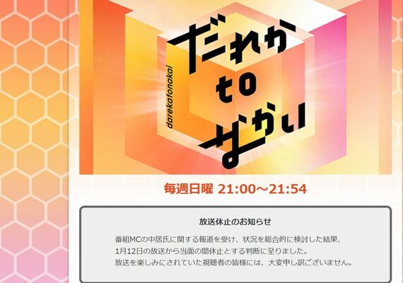 19日現在、公式サイトでは「番組MCの中居氏に関する報道を受け、状況を総合的に検討した結果、1月12日の放送から当面の間休止とする判断に至りました」との文言があるが…/出所:「だれかtoなかい」公式サイト