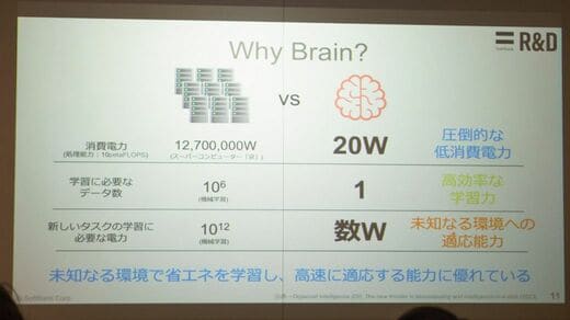 現在のAIやスーパーコンピューターは、トランジスタのオン・オフで情報処理を行い、大規模な演算には相応の電力とデータが必要だ。量子コンピューター(QPU)も大がかりな装置を要し、実用化には課題が多い。一方で、人間の脳は成人でもおよそ20W(スマートフォン数台分の充電相当)の電力で日常的な思考や学習をこなしている。