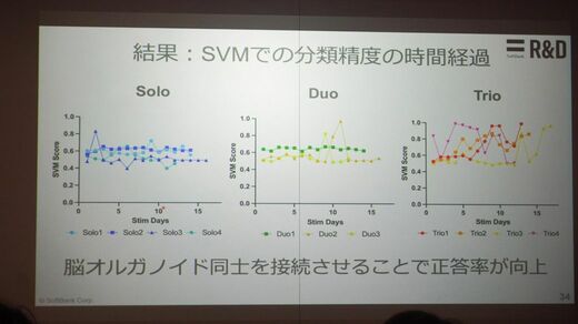 実験では、オルガノイドを単体(Solo)、2個接続(Duo)、3個接続(Trio)の条件で刺激の分類タスクを行ったところ、個数が増えるほど分類精度が上がる結果が得られた。池内准教授は「オルガノイドを連結した部分の結合は弱くなりがちですが、強い結合部と弱い結合部が組み合わさることで情報処理が可能になる」と説明する。この“コネクトイド”技術が大規模に展開できれば、さらに複雑なタスクへ応用できるようになるかもしれない。
