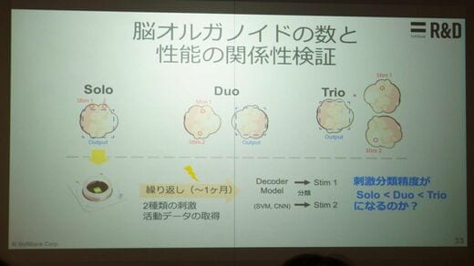 ただし、現状のオルガノイドはまだ発展途上で、ソフトバンク先端技術研究所の朝倉慶介氏は「まるで赤ちゃんの脳のような段階」と述べる。培養には3~6カ月かかり、温度や栄養を細かく管理する手間も大きい。また、生物由来のため個体差があり、同じ刺激を与えても反応が異なるケースが多いという。