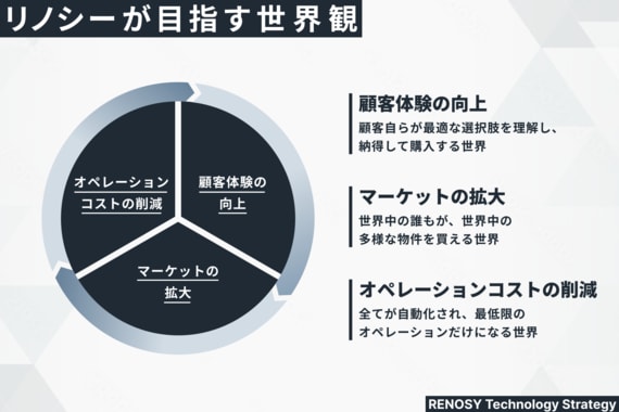 トップダウンといっても現実とかけ離れたビジョンでは説得力がない。熊谷氏が現場でのヒアリングを重ねたうえで策定したプロダクトビジョンの3つの柱が「顧客体験の向上」「マーケットの拡大」「オペレーションコストの削減」だ。