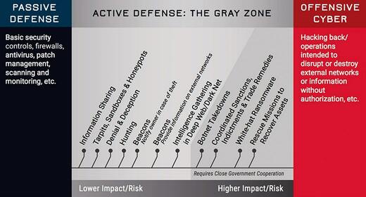 さまざまなサイバーセキュリティ活動を、防御のための活動からサイバー攻撃まで分類している。左側が防御、右側がサイバー攻撃となる。間がグレーゾーンとされているセキュリティ対策や活動だ。