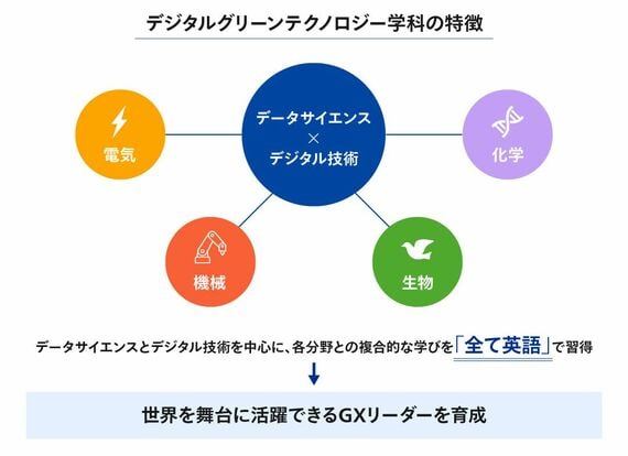 デジタルグリーンテクノロジー学科は、カリキュラムの中心にデータサイエンスやデジタル技術を据えて、電気・機械・生物・化学といった既存の理工学分野との複合的な学びを提供する予定だ。また、講義や研究指導はすべて英語で行われることになっており、外国人教員を含む新学科の教授陣により、グローバルな視野を持った人材の育成を目指す。