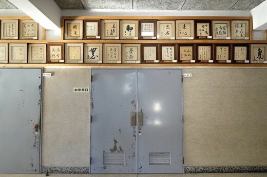 事務所の上にある大講堂の前には、過去に大講堂で講演をした著名人の色紙が飾られている。