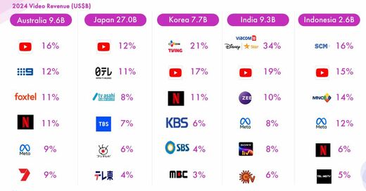 これに続くのがフジテレビを含む地上波テレビ局各局。動画配信プレイヤーが主役の座を奪うアジアの主要国と比べると、日本市場だけがYouTubeを除き、テレビ局が上位を占めるという特殊な状況です。