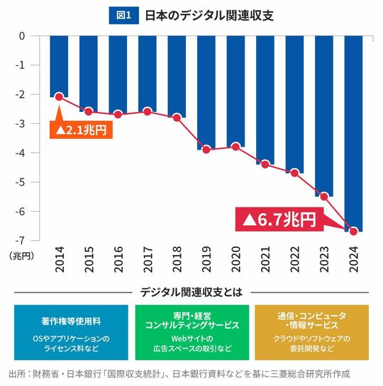 デジタル赤字はなぜこれほどの注目を集めたのか。1つはやはり、金額規模のインパクトだろう。2024年のデジタル関連収支※1は6.7兆円もの赤字となっている。2014年は2.1兆円の赤字だったから、10年あまりで3倍以上に拡大したことになる(図1)。しかもこの赤字額は、同じサービス収支の項目で比較すると同年のインバウンドによる5.9兆円の黒字(旅行収支)を大きく上回る。国を挙げて取り組むインバウンド施策の効果をすべて打ち消す金額を、われわれはビッグテックなどに支払っているということだ。