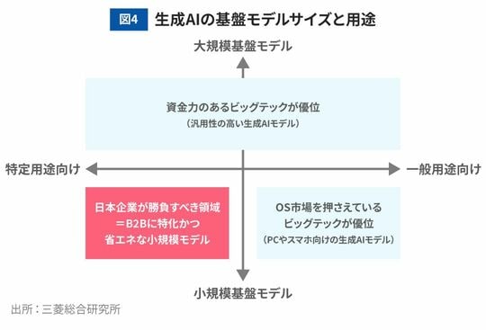 企業や個人がデジタル技術を制約なく活用できるよう、電力制約の問題に対応できれば、日本のICT企業が国際競争力を強化する契機となりうる。とくに期待できるのは省電力化に資するような生成AIの基盤モデルの開発だ。現在広く普及している大規模基盤モデルの生成AIは、あらゆる用途で活用できる反面、計算量が多くなりがちで、電力消費が大きい。そこで、電力消費も投資額も小さめの、特定用途に特化した小規模基盤モデルに注力していくことが、有効な競争戦略と考えられる(図4左下)。