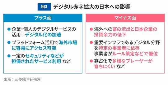 まず前提として認識しておきたいのは、デジタル赤字は必ずしも悪い面ばかりではないということだ(図3)。そもそも「赤字」という表現からマイナスのイメージを受けやすいが、企業業績の収支と異なり、国際収支項目における赤字はそれ自体が悪いわけではない。
