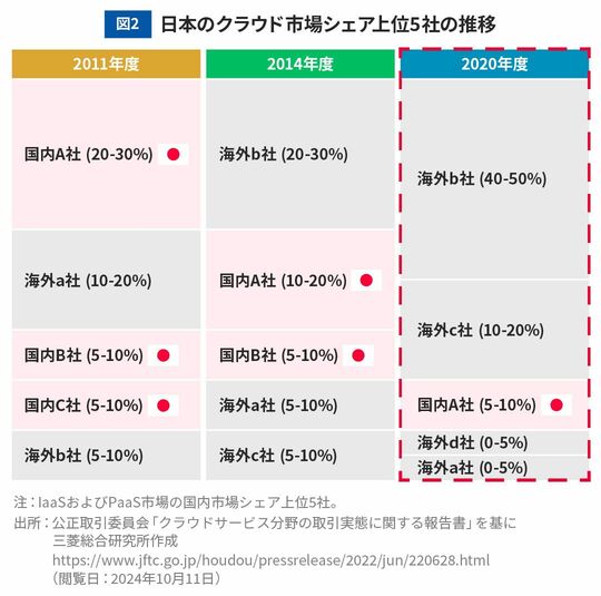 デジタル赤字が注目されたもう1つの理由は、「日本のICT産業の競争力低下」という現実を象徴的に示したことだ。国内のICT事業者がビッグテックなどに比べ魅力的なサービスを提供できず、収益機会を奪われたことが、デジタル赤字拡大の大きな要因となっている。例えばクラウド市場のシェアを見ると、2011年度時点では、市場シェア上位5社のうち3社が日本企業だった。それが2020年度には、上位5社のうち日本勢は1社に減り、市場シェアも大きく減退している(図2)。
