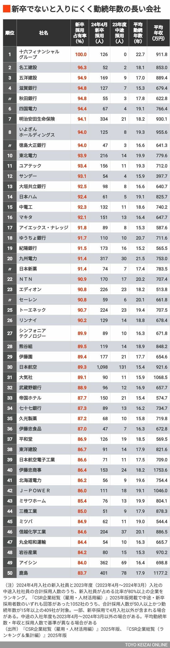 ビジネス #CSR企業総覧 前の記事 次の記事 新卒でないと入りにくいが、勤続年数は長い71社 1位は100%!新卒採用占有率を調査した結果 5分で読める 公開日時:2025/01/27 05:40 山谷 明良 東洋経済データ事業局 フォロー 1/4 PAGES 2/4 PAGES 3/4 PAGES 1~50位 次ページが続きます 4/4 PAGES