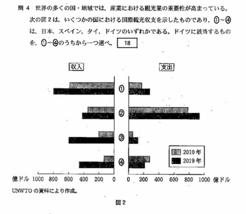「地理総合 地理探究」第4問の問4では、「世界の多くの国・地域では、産業における観光業の重要性が高まっている」と示したうえで、4カ国の国際観光収支のグラフから日本、スペイン、タイ、ドイツを判別するという問題が出題されました。