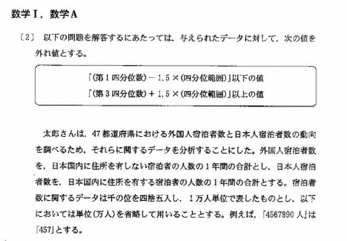 また、意外なところでは、「数学IA」第2問[2]のデータの分析に関する問題で、47都道府県における外国人宿泊者数と日本人宿泊者数が題材とされていました。