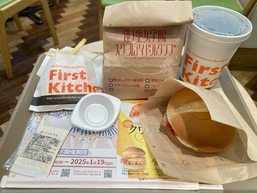 券売機でフレーバーポテトとディップポテト、そしてベーコンエッグバーガーと、ヘビーな食事のお供に強焙煎ほうじ茶も注文し、着席。