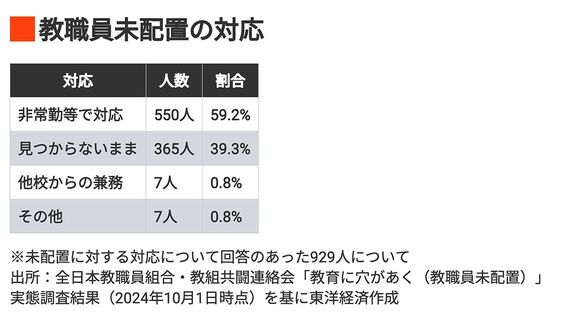 未配置に対する対応としては、「非常勤等で対応」が550人で59.2%、「見つからないまま」は365人で39.3%、他校からの兼務は7人で0.8%だった。