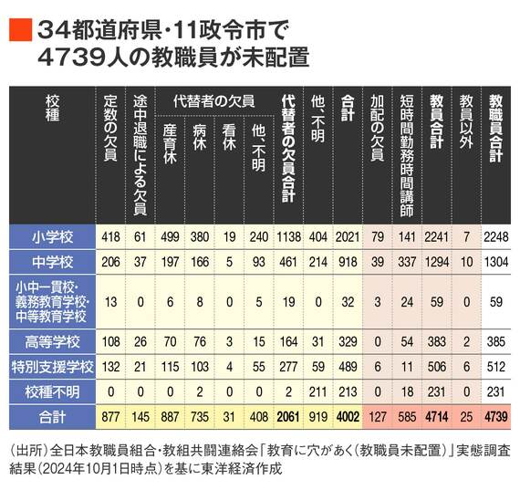 全日本教職員組合(以下、全教)は今月、「教育に穴があく(教職員未配置)」実態調査結果(2024年10月1日時点)を公表し、教員の数が本来必要な数に達していない「教員未配置」が、34都道府県11政令市で4739人に達していることを明らかにした。