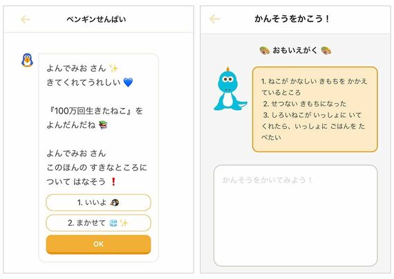 昨年11月には、得意技を持つ「たいこのきょうりゅう」を追加した。「おもいえがく」という読書家のワザを教えてくれるAIキャラクターだ。五感を使って情景を描く力を伸ばすような問いかけをし、引き出した子どもの感想を箇条書きにして提示する。子どもはそれを基に自身で感想文を書いていく。