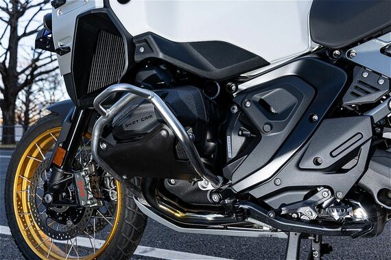 R1300GSアドベンチャーは、1300ccの排気量から最高出力107kw(145ps)/7750rpm、最大トルク149Nm(15.2kg m)/6500rpmを発揮するので、車重269kg(走行可能状態)でもスタートに不足はない。むしろ、その巨大なトルクは、市街地であれば時速50km/hで6速2000rpmという走行が可能だ。
