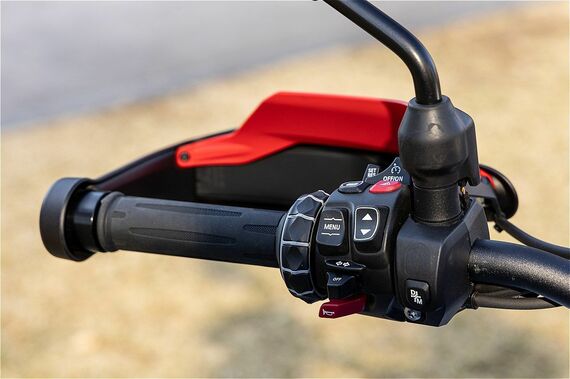 左手のバックミラー取り付けホルダーの下にある“M”シフトモード/“D”シフトモードの切り替えスイッチを押すことで、いわゆるマニュアルの「“M”シフトモード」と、オートマの「“D”シフトモード」の変更が可能だ。左手親指で走行中も任意で切り替えられるプッシュスイッチは、冬場の厚手のグローブでも節度感のある扱いやすさだ。ただ、グリップからプッシュスイッチまでは多少距離があるので、筆者は左手を一旦はずしたほうが切り替えやすかった。デバイスが多く、スイッチのオンパレードとも言えるハンドルまわりだが、慣れてしまえば使いやすくなるだろう。