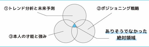 これらの3つの要素が重なる場所に、「ありそうでなかった絶対領域」が存在します。この「絶対領域」を見つけることで、自分だけのユニークなビジネスコンセプトを作り上げ、フリーランスとして独自のポジションを確立することが可能になります。初めは難しく感じるかもしれませんが、実際にはそれぞれの要素を深掘りしていくことで、思ったよりも簡単に見つけることができます。
