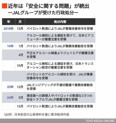 コロナ禍で航空各社が減便をしていた2020年〜2022年を除くと、2018年以降のJALは毎年のように国交省から処分を受けている。まさに異常事態だ。八田氏は「破綻前のように各部門がバラバラになっており、内部統制や管理体制に目詰まりが起きている」と指摘する。