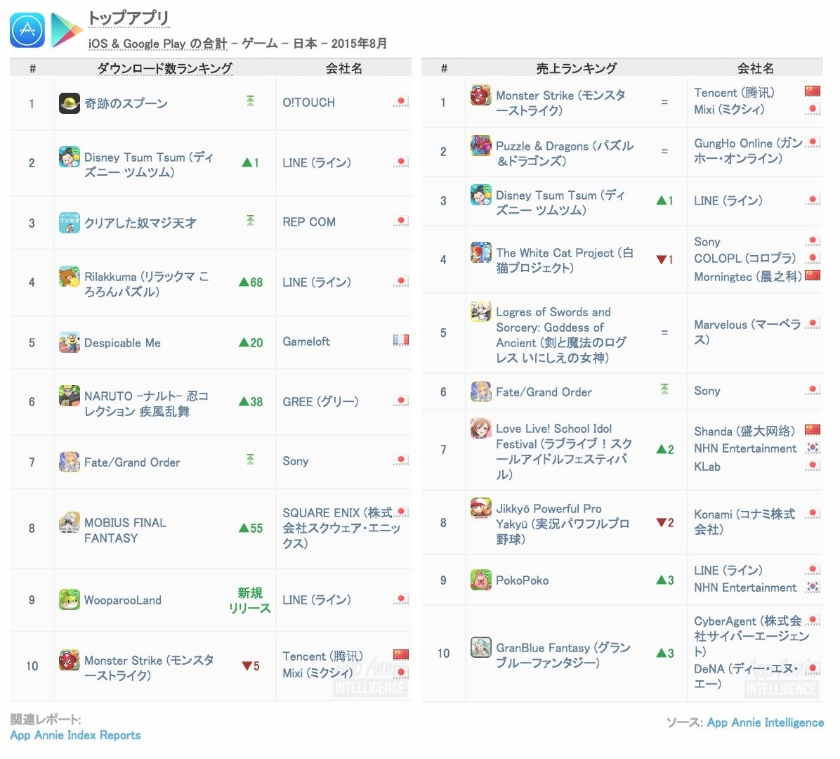 アイテム課金などが多いタイトルを順番に並べた売り上げランキングでは、1位、2位は不動だ。注目すべきは、ロールプレイングゲーム「Fate/Grand Order」が6位に躍進したこと。同ゲームの運営開始は7月30日(Android版)、8月12日(iOS版)。まだ日が浅いことを考えると、驚異的な躍進を遂げたといえる。売り上げランキング2強の座を脅かす存在になるかもしれない。