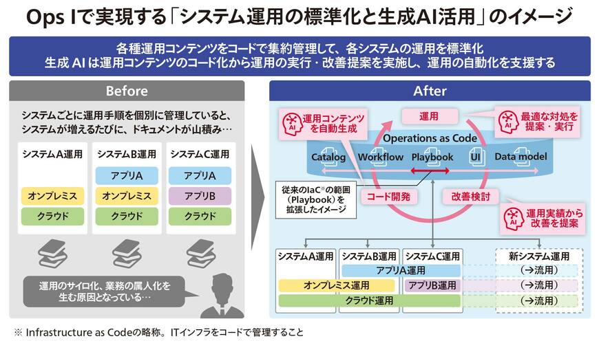 すでにOps Iを導入済みの企業では、運用管理の標準化と効率化を実現し、IT部門の変革を進めている。例えばある企業では、パブリッククラウド基盤の運用プロセスをOps Iによって標準化し、社内の利用申請業務の処理を自動化。同社はシステム運用管理を内製化、効率化したいと考えていたが、Ops Iによって業務を標準化することで、社内の人員でも効率的な運用ができるようになったという。