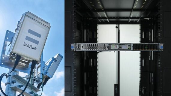ソフトバンクのAI-RANアンテナ(左)と、近くに置かれたGPUサーバー(写真:ソフトバンク)