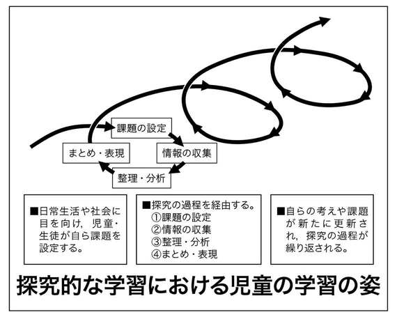 そして、この探究的な学習を具現化するには、「課題の設定」「情報の収集」「整理・分析」「まとめ・表現」を繰り返しながら高めていくことが必要だと指摘している。
