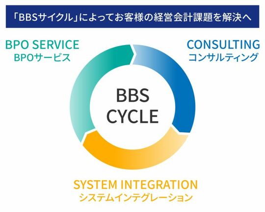 当社の最大の強みは、「コンサルティング、システムインテグレーション、マネジメントサービス(BPO)」からなる「BBSサイクル」です。公認会計士や税理士をはじめ、さまざまな領域のプロフェッショナルが在籍していて、高度で複雑な経理業務にも対応できる力を備えています。