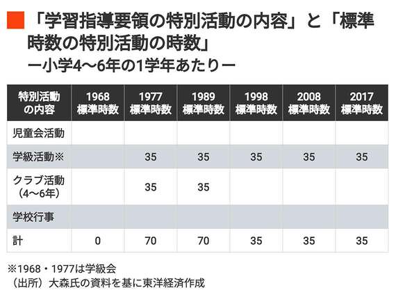 なので、例えば1989年には学級活動とクラブ活動は、授業時数として35時間ずつがカウントされていますが、1998年には学級活動だけがカウントされています。