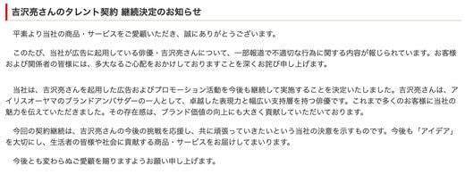 発表文では顧客や関係者に「多大なるご心配をおかけしております」と謝罪しつつも、吉沢さんの「卓越した表現力と幅広い支持層」からなる存在感が、ブランド価値向上に貢献したと評価し、「吉沢亮さんの今後の挑戦を応援し、共に頑張っていきたいという当社の決意」として継続を決めたと明かした。