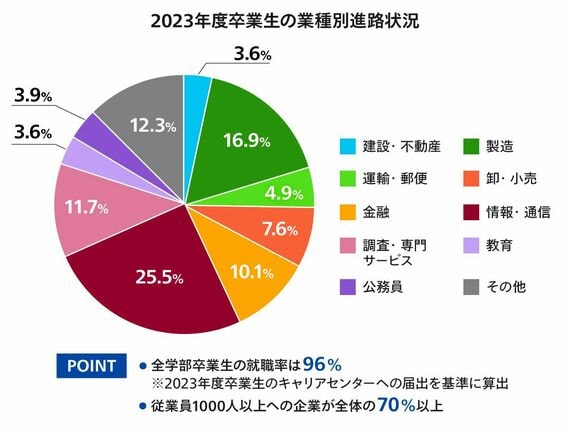 1学年約2900人の学生が在籍する上智大学。近年の学生の就職先の傾向としては、情報・通信系企業への就職が上位を占めつつも、製造や金融など多岐にわたり、学部・学科に縛られない多様性を見せている。また2023年度の卒業生の進路実績では、従業員1000人以上の大手企業への就職が70%以上と高い割合を示した。