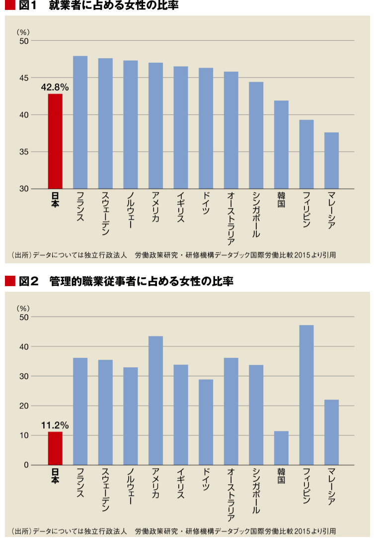 一方で、日本の女性管理職率は11.2%と、欧米諸国の平均30〜40%と比較しても、やはり極端に低い水準です(「データブック国際労働比較2015」(独立行政法人労働政策研究・研修機構)より引用)。日本は、女性の就業率においては、諸外国との差がわずかにもかかわらず、なぜ、女性の管理職率が極端に低いのでしょうか?