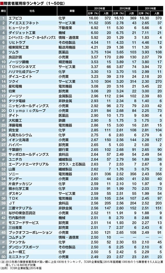 東洋経済はこの時期に合わせて障害者雇用率ランキングを毎年公表している。今回は『CSR企業総覧』2015年版掲載1305社の中から、2013年度で障害者を5人以上雇用している843社を対象に作成した。早速、上位企業を見ていこう。