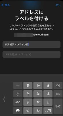 次の画面で「新しいアドレスを作成する」を選ぶと、非公開用のメールが作成される。こちらのアドレスはアットマーク以下が「icloud.com」になっている。提示された文字列でよければ、「続ける」を選択。次に出てきた画面では、アドレスにラベルをつける。どのサービスに登録するメールアドレスかわかりやすいよう、名前を書いておくといいだろう。