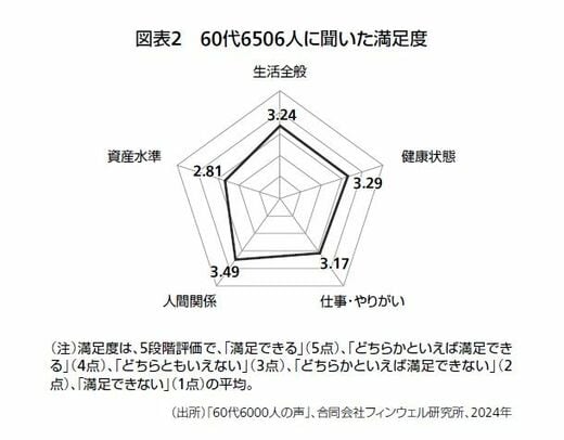 同調査では、生活全般の満足度の他に、その構成要素となる4つの項目の満足度も併せて聞いています。具体的には、「健康状態」「仕事・やりがい」「人間関係」、そして「資産水準」の満足度について、先の項目と同様に5段階で評価してもらっています。