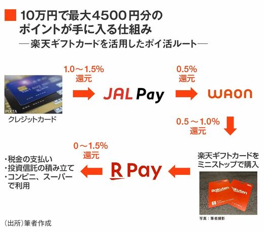 まず、自身が保有しているクレジットカードから、JALが運営するJAL Payという決済サービスへチャージを行う。このクレジットカードで決済したときに、購入額の1.0~1.5%分がポイントとして還元される。