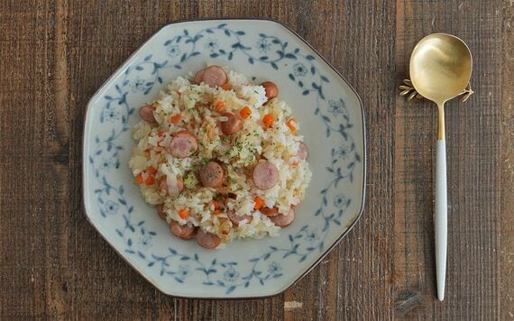 ソーセージは2〜3mm厚の薄切り、玉ねぎとにんじんは5mm角に切ります。にんじんを切るのは手間ですが、甘みが加わることでピラフらしい洋風の味わいが出ます。