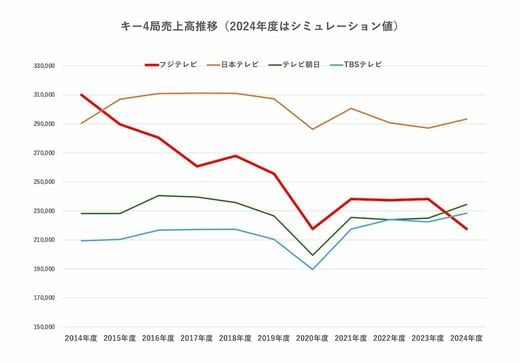 するとフジテレビの売上高は2187億円、2位からさらに落ちて4位になる。あくまでシミュレーションだが、233億円がどれだけ痛手かがわかる。各局の数字はぶれるかもしれないが、フジテレビ4位転落は間違いないだろう。
