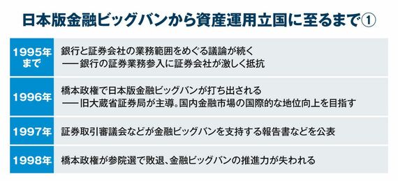 「資産運用立国の源流は1996年の金融ビッグバンにある」──。金融庁の局長経験者はこう語った。同年11月に当時の橋本龍太郎首相は、日本の金融市場が2001年までにニューヨークやロンドンに匹敵する国際的地位を獲得することを目指し、金融システム改革、いわゆる日本版金融ビッグバンへの取り組みを指示した。