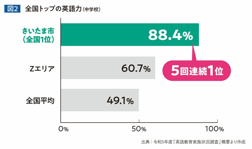 さいたま市は人口増加数・転入超過数ともに全国トップクラスだ。とくに0~14歳の転入超過数は2023年まで9年連続で全国1位。文部科学省の「令和5年度英語教育実施状況調査」(図2)では、中学3年生の英語力が5回連続全国1位となり、教育に力を入れていることも働き盛りである子育て世代から選ばれている要因の1つとなっている。