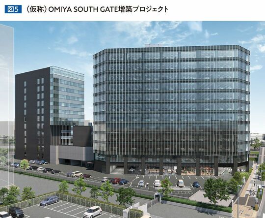 今後、さいたま市では大宮駅周辺やさいたま新都心駅周辺を中心に、大型オフィスの供給が予定されている。2025年度にはさいたま新都心駅近くで(仮称)OMIYA SOUTH GATE増築プロジェクト(図5)が、その後大宮駅東口大門町3丁目中地区、大宮駅西口第3‒A・D地区で再開発ビル事業の計画が進められている。