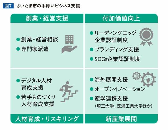 移転後も、市とその外郭団体であるさいたま市産業創造財団などがビジネスマッチングをはじめ、ブランディング支援や経営相談、新事業の実施に向けた海外展開や産学連携などの手厚い支援を実施している。(図7)