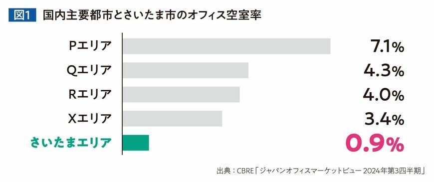 「堅調なのがさいたま市です。2024年第3四半期のデータでは0.9%と、国内主要都市で最も低い空室率となっています」(図1)