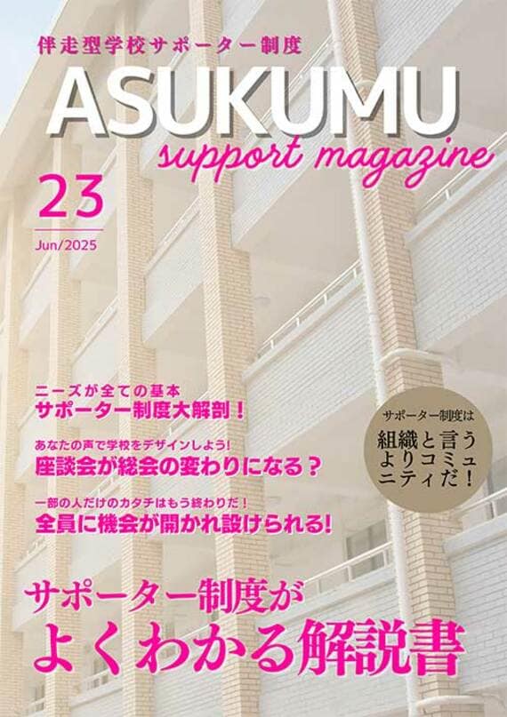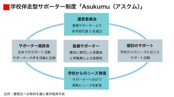 新たな仕組みの名称は、「学校伴走型サポーター制度Asukumu(アスクム)」。「アスクム=明日を組む」で、「児童生徒、学校、サポーター全員の明日を考えサポートしよう」という思いがこめられている。