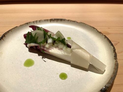 導入のエモーションでは、エンダイブやアンティーブといった野菜や、キャビアなど、鮨コースの“つまみ”では見かけられない食材が用いられている。つまみから握りに近づくと米や青海苔が使われるようになり、鮨にスムーズに移行することができる。