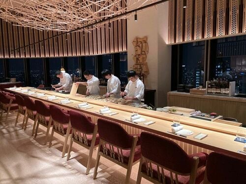 鉄板焼ではこのような造りが見かけられるが、高級鮨店では珍しい。フランス料理は1人で食べるものではなく、会話を楽しみながら複数人で楽しむものだが、ここではそのエッセンスが汲み取れる。