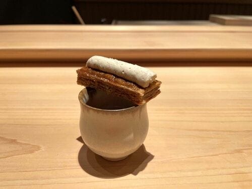 牡丹海老は燻香をまとって非常に香り高く、再び食欲がかきたてられるのがいい。高級鮨でも甘味がつかないことは多く、あったとしてもフルーツやアイスクリームくらいだが、さすがフランス風とあってデザートにも力が入れられている。定番のミルフィーユなど数品のデザートが提供されるのだ。